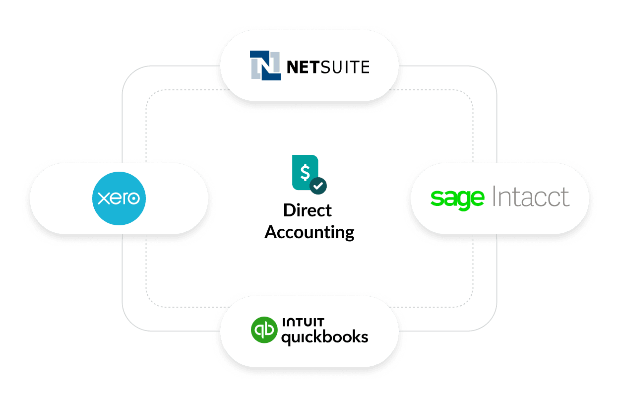 Connect with Quickbooks, Netsuite, Sage Intact, Xero, or use a custom export template.