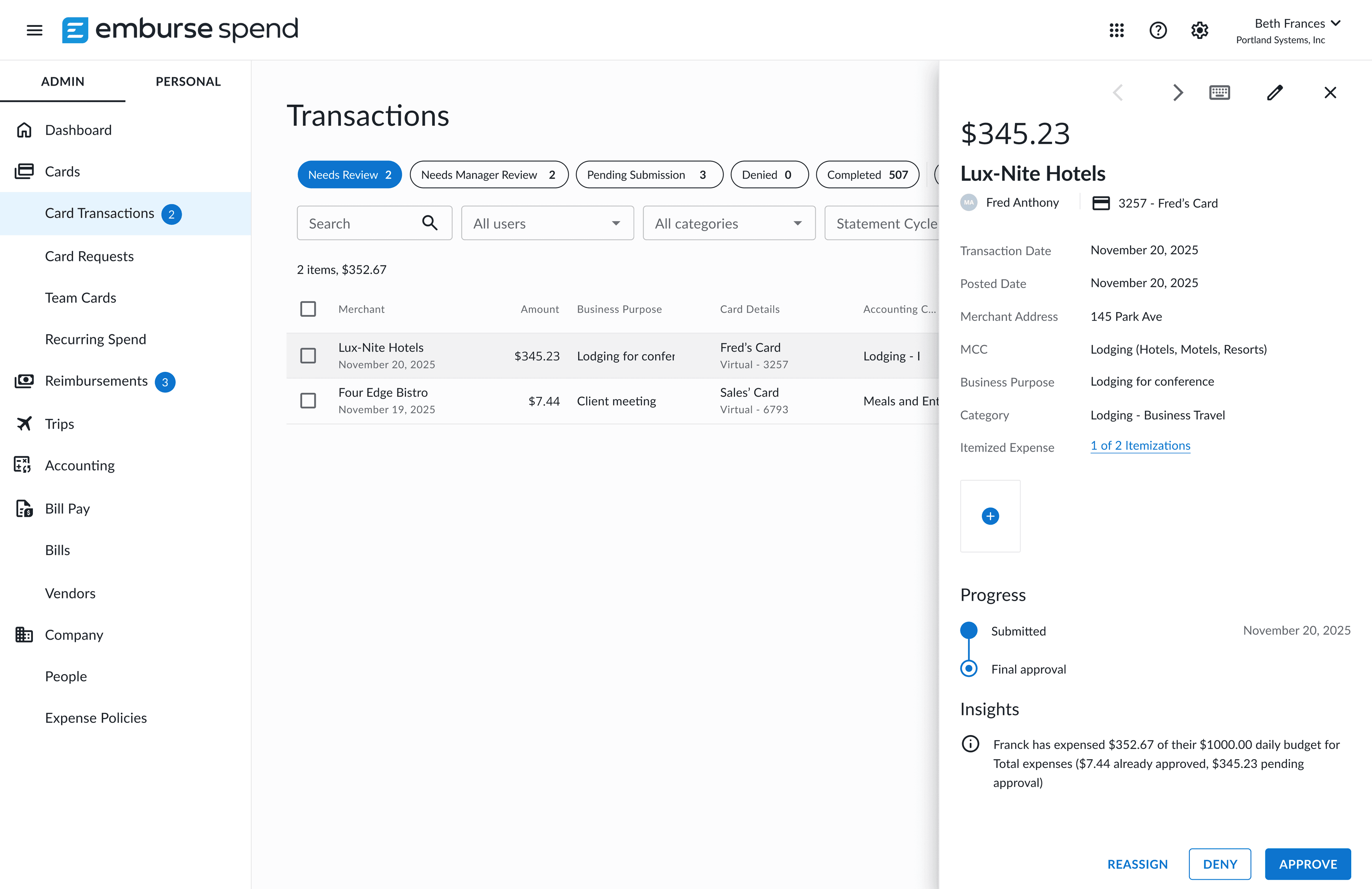 Finance teams can review and approve out of pocket expenses and trigger ACH reimbursements directly within Emburse Spend, reducing manual work.